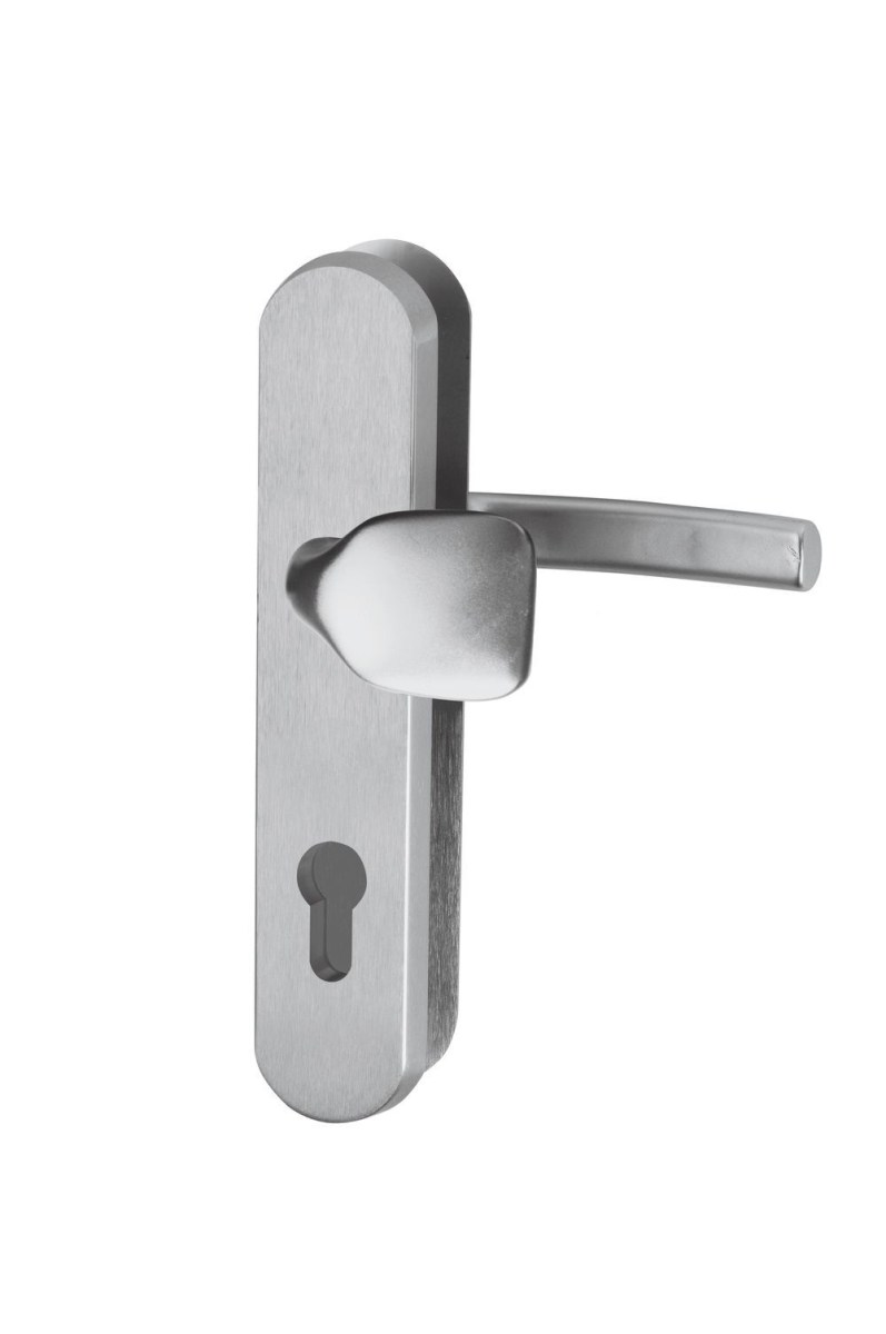 Bezpečnostné kovanie v prevedení kľučka - madlo, s prekrytím vložky (ZA), rozteč 90mm Povrchová úprava - imitácia nerezu (F9) Trieda bezpečnosti 3 Použite s cylindrickou vložkou v triede bezpečnosti minimálne 3 Vhodné pre hrúbku dverí: 40-55mm (pre hrubšie dvere je nutné doobjednať predlžovaciu sadu)