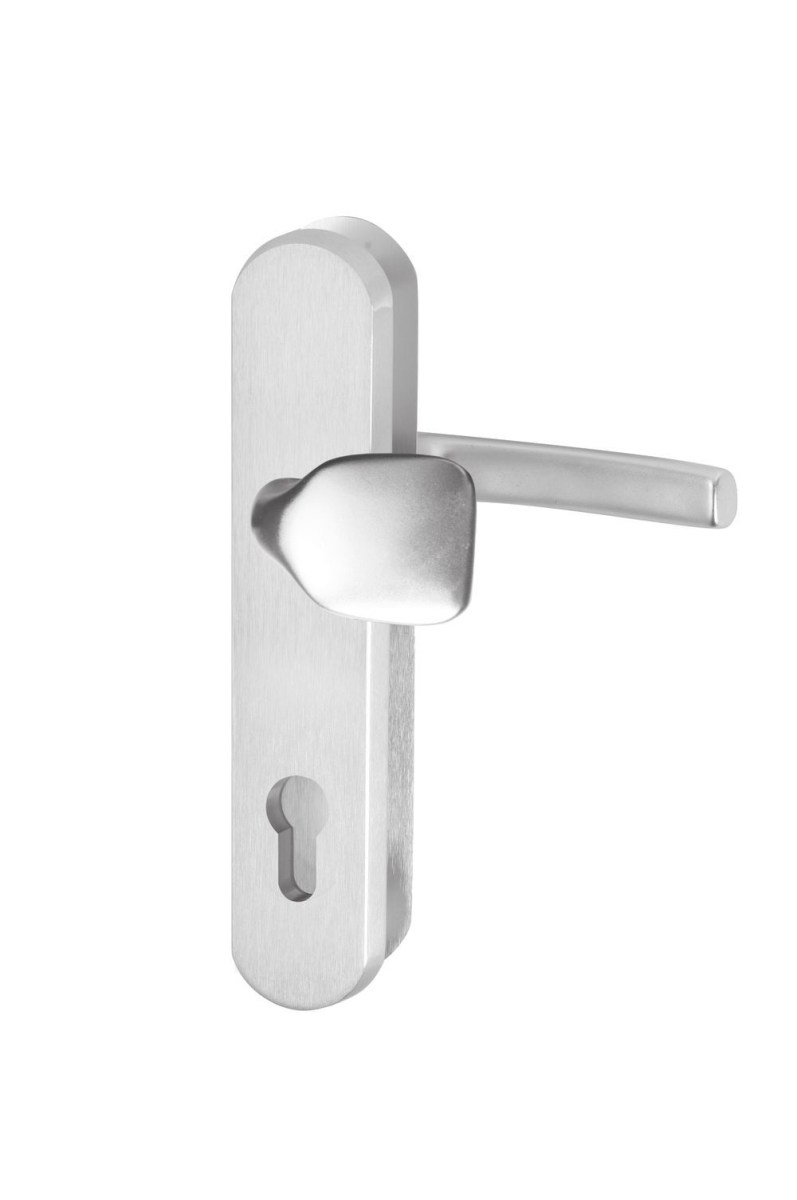 Bezpečnostné kovanie v prevedení kľučka - madlo, bez prekrytia (PZ), rozteč 72mm Povrchová úprava strieborný elox (F1) Trieda bezpečnosti 2 Použite s cylindrickou vložkou v triede bezpečnosti minimálne 2 Vhodné pre hrúbku dverí: 40-55mm (pre hrubšie dvere je nutné doobjednať predlžovaciu sadu)