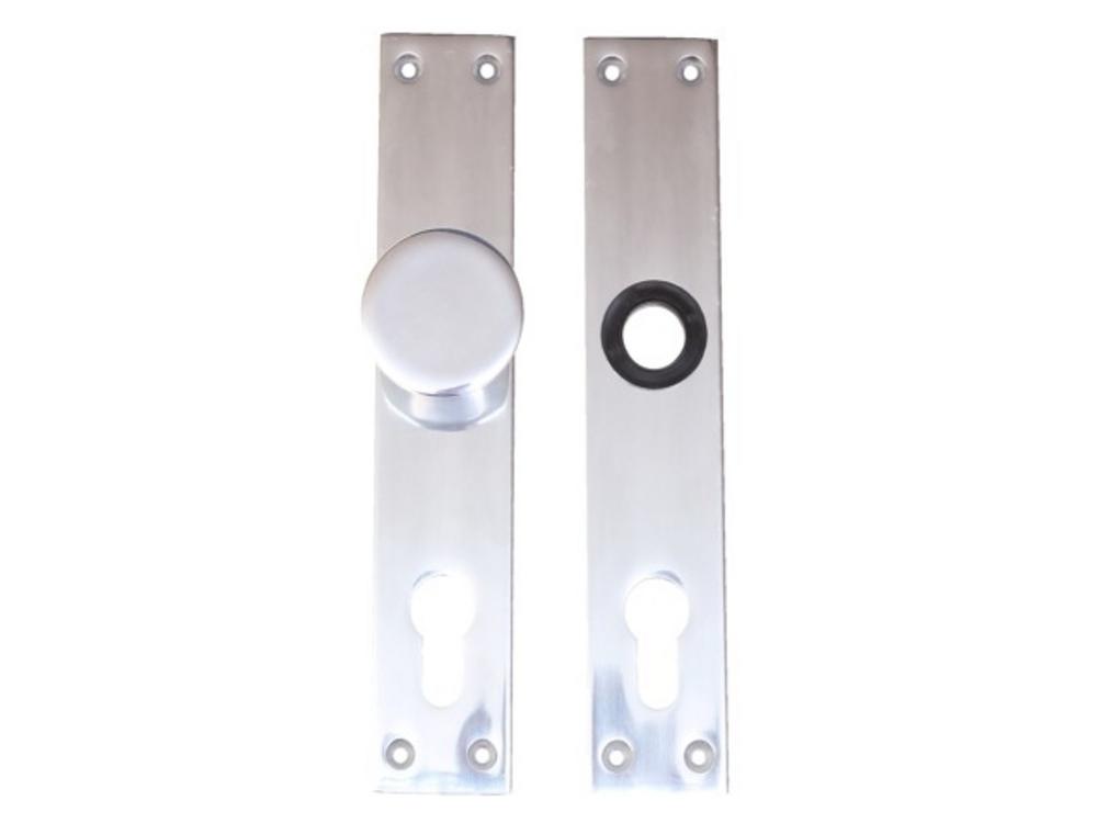 Hliníkové štítové kovanie s guľou bez kľučky v prevedení na vložku, rozteč 72mm Dĺžka: 220mm Šírka: 38mm Hrúbka: 5mm Rozteč: 90mm Rozteč otvorov na vruty: 200mm na výšku a 23mm na šírku Materiál: vysoko leštený hliník V Balení sa nachádzajú 2 kusy štítov