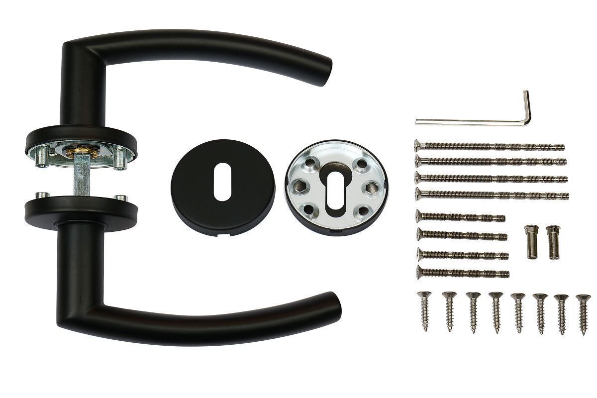 Nerezové kovanie s okrúhlymi rozetami v prevedení na kľúč Vhodné pre hrúbku dverí 32 – 77 mm Praktické 2 sady šróbov bez nutnosti skracovania V balení spolu so spojovacím materiálom, vŕtacou šablónou a návodom na montáž