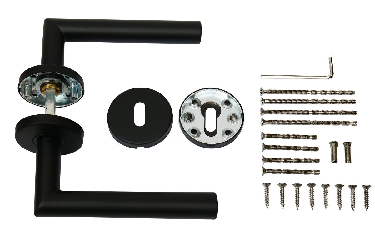 Hliníkové kovanie s okrúhlymi rozetami v prevedení na kľúč Vhodné pre hrúbku dverí 32 – 58 mm V balení spolu so spojovacím materiálom, vŕtacou šablónou a návodom na montáž