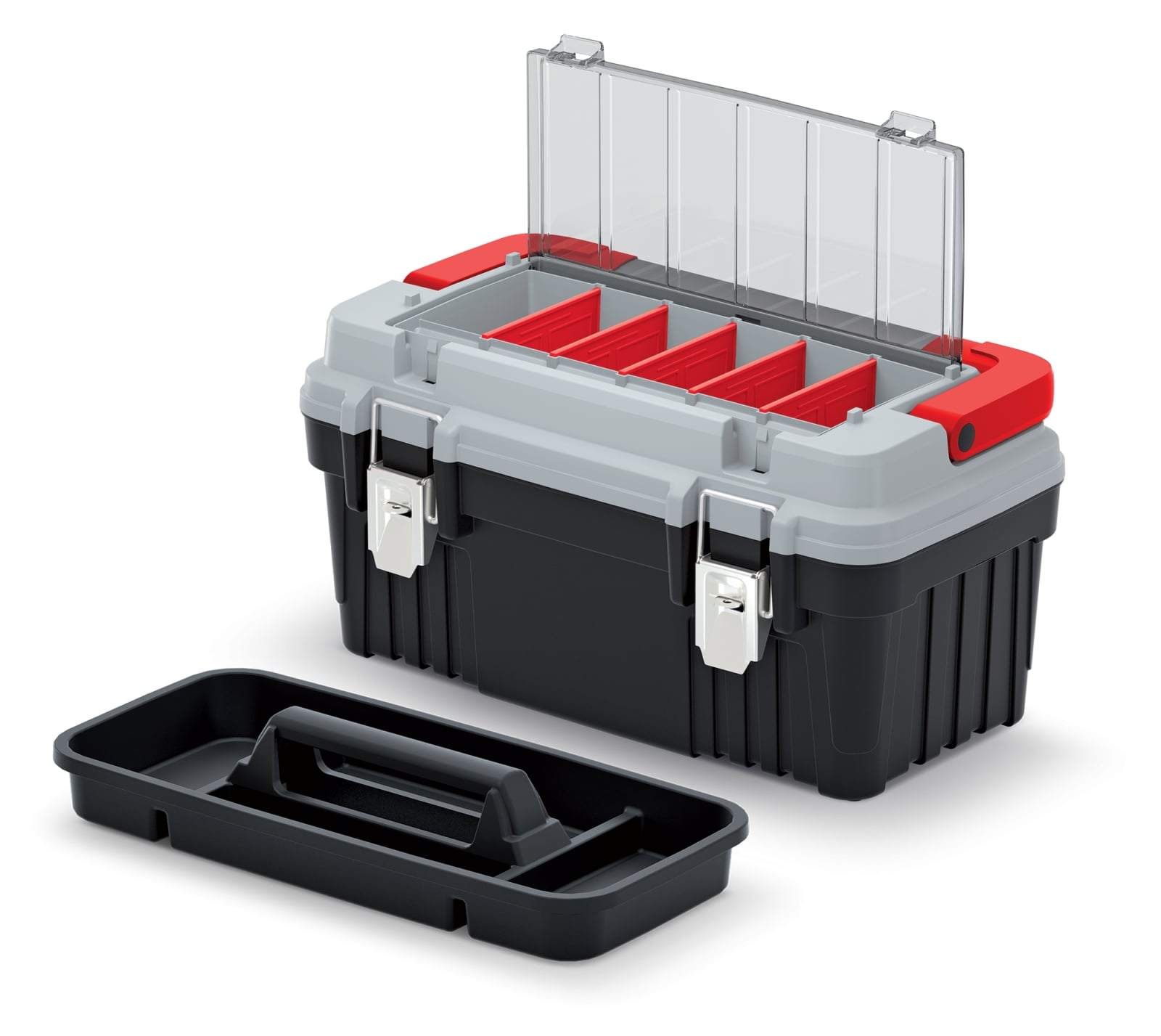 Tento jednoduchý kufor na náradie dobre poslúži každému majstrovi alebo údržbárovi Konštrukcia je z tvrdeného plastu, čo schránke prepožičiava mechanickú odolnosť a nosnosť až 13 kg Rozmery: 47x25,6x23,8cm Objem: 23l Nosnosť: 13kg
