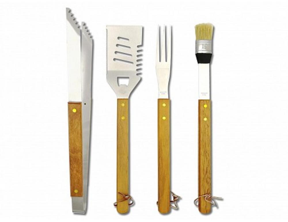 Štyri nepostrádateľné nástroje, ktoré zabezpečia pôžitok zo samotného grilovania Základom výroby je kvalitná nehrdzavejúca oceľ Vďaka drevenej rukoväti sa náradie pohodlne drží a zbytočne sa nezohrieva. Konce rukovätí sú vybavené očkami na zavesenie a jednoduché skladovanie Sada obsahuje obracač vybavený otváračom nápojov, trojzubou vidličkou, kefou a robustnými kliešťami pre ľahkú a bezpečnú manipuláciu Dĺžka: 420 mm Materiál: nerez/ drevo