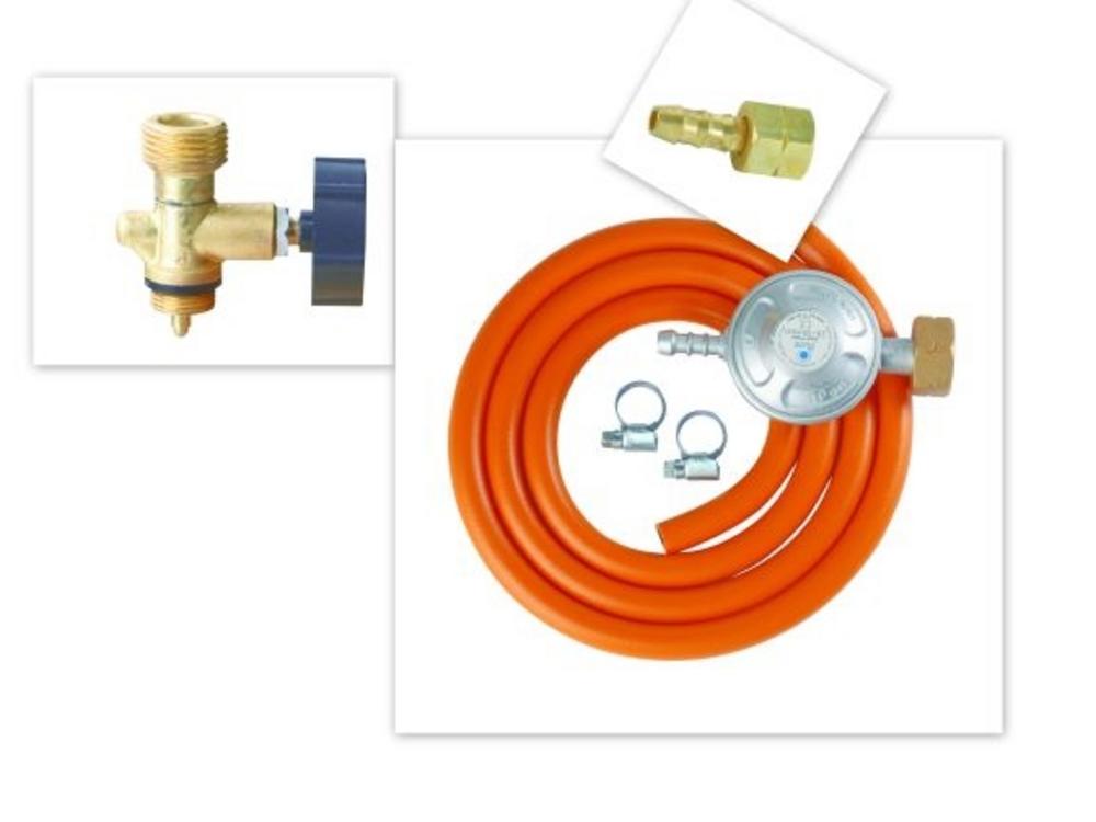 Set: hadica 1,5 m, 2 hadicové spony, regulátor tlaku (105737), nátrubok (105746), jednocestný ventil (105752) Rozmery: 225x40x225mm Hmotnosť: 800g