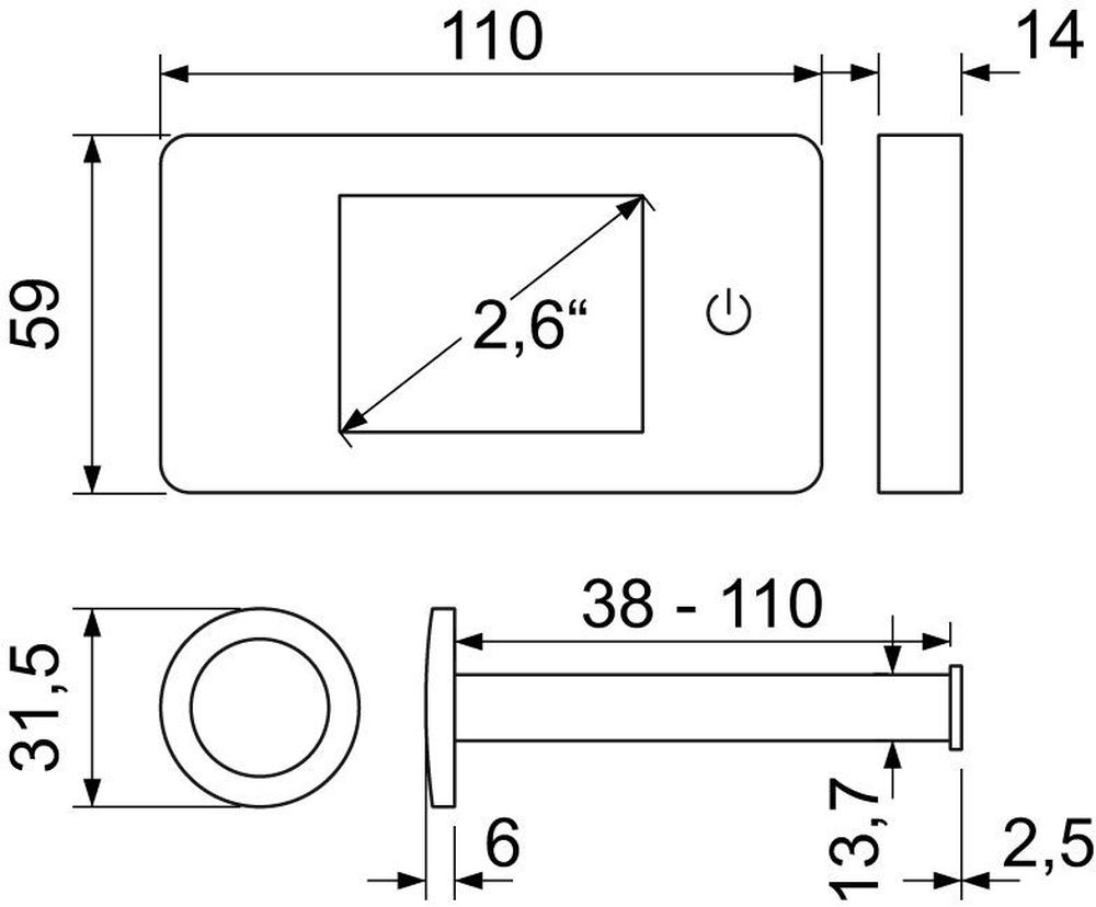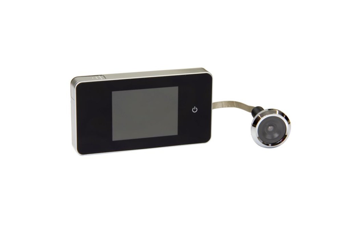 Digitálne kukátko s kamerou pre monitorovanie prostredia pred dverami Obrazovka sa aktivuje tlačítkom na vnútornej strane Automatické vypnutie po 10 sekundách Jednoduchá výmena za súčasné kukátko Kamera 0,3 MP, pozorovací uhol 100° Obrazovka 2,6´´ LCD 76 800 pixelov Vhodné pre hrúbku dverí 38-110mm Batérie AA sú súčasťou balenia Rozmery: 110x59x14mm