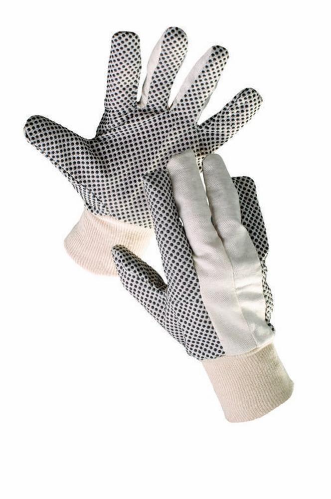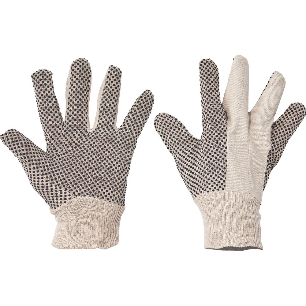 Rukavice šité z bavlneného plátna, s PVC terčíkmi v dlani a na prstoch a pružným nápletom Materiál: bavlna / PVC - terčíky Veľkosť: 10 Balenie: pár