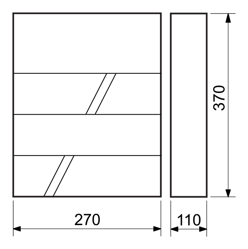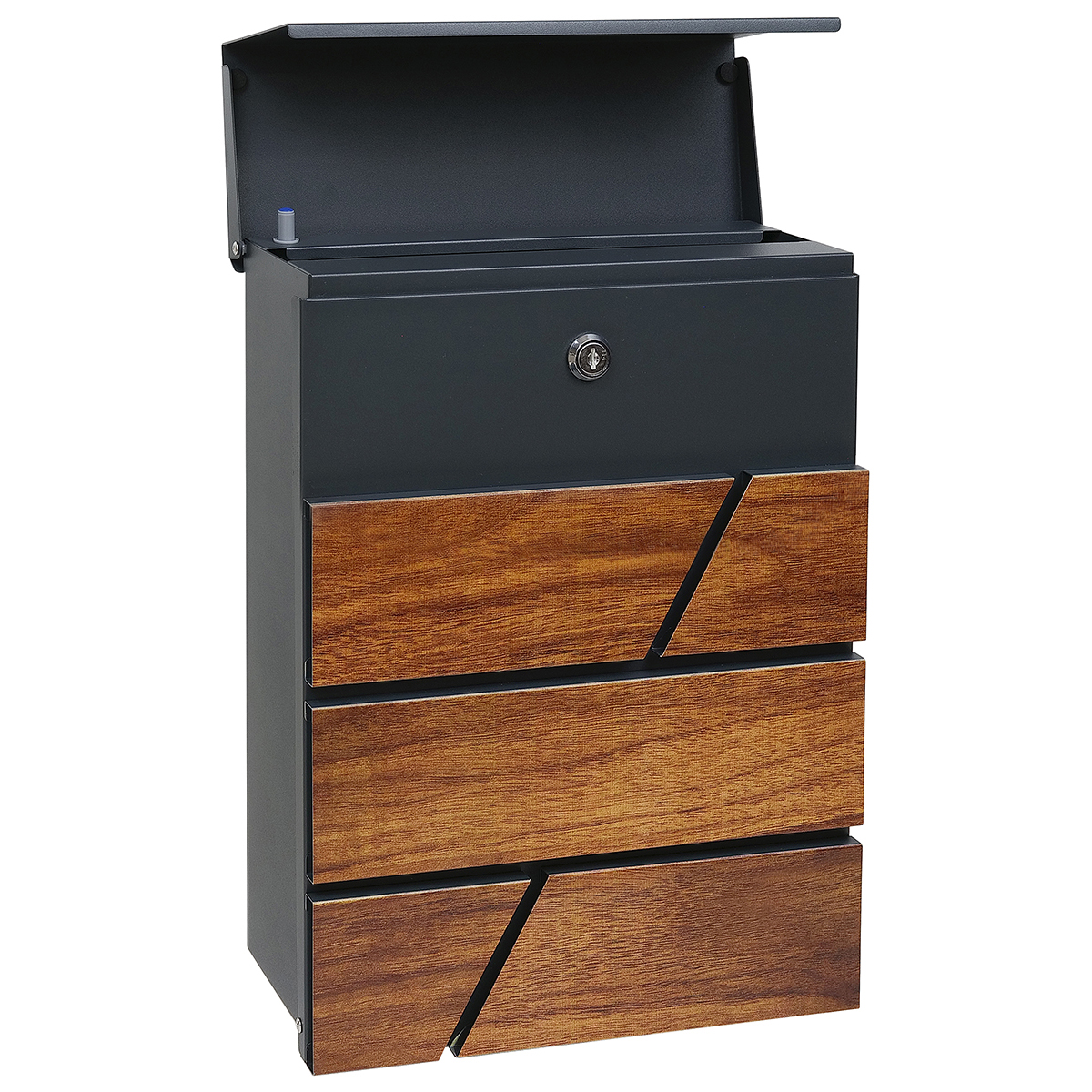 Oceľová domová schránka v modernom dizajne vhodná do interiéru i exteriéru Funkcia tichého dovierania striešky pomocou brzdy Šírka:270 mm Výška:370 mm Hĺbka:110 mm Rozmer vhodu: 260x30 mm Materiál: ocel hrúbka 0,9 mm Povrchová úprava: antracit matná (RAL7016)/Imitácia dreva potlač -WO Balenie obsahuje montážny materiál a 2 ks kľúčov na otvorenie zámku Hmotnosť netto: 2,1 kg