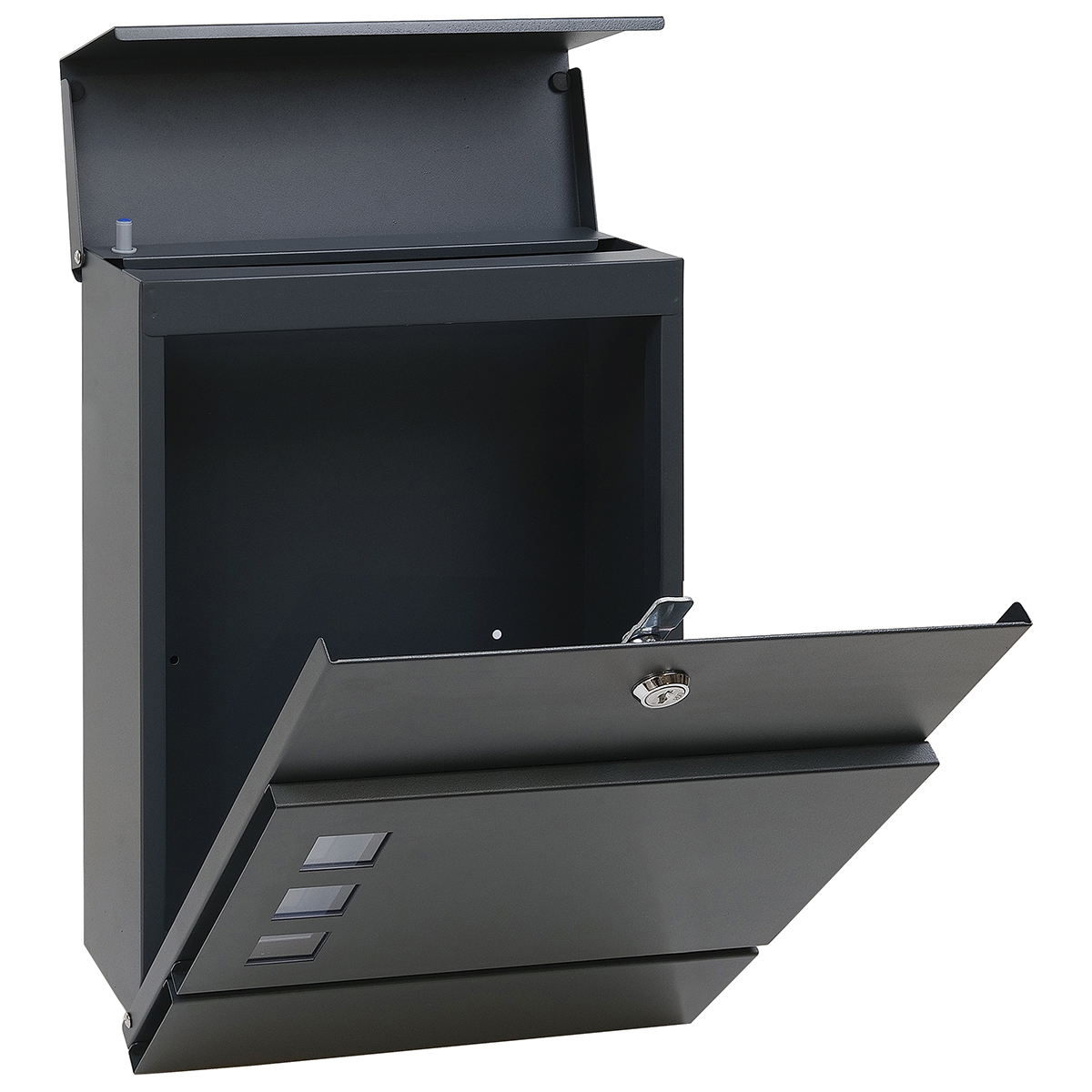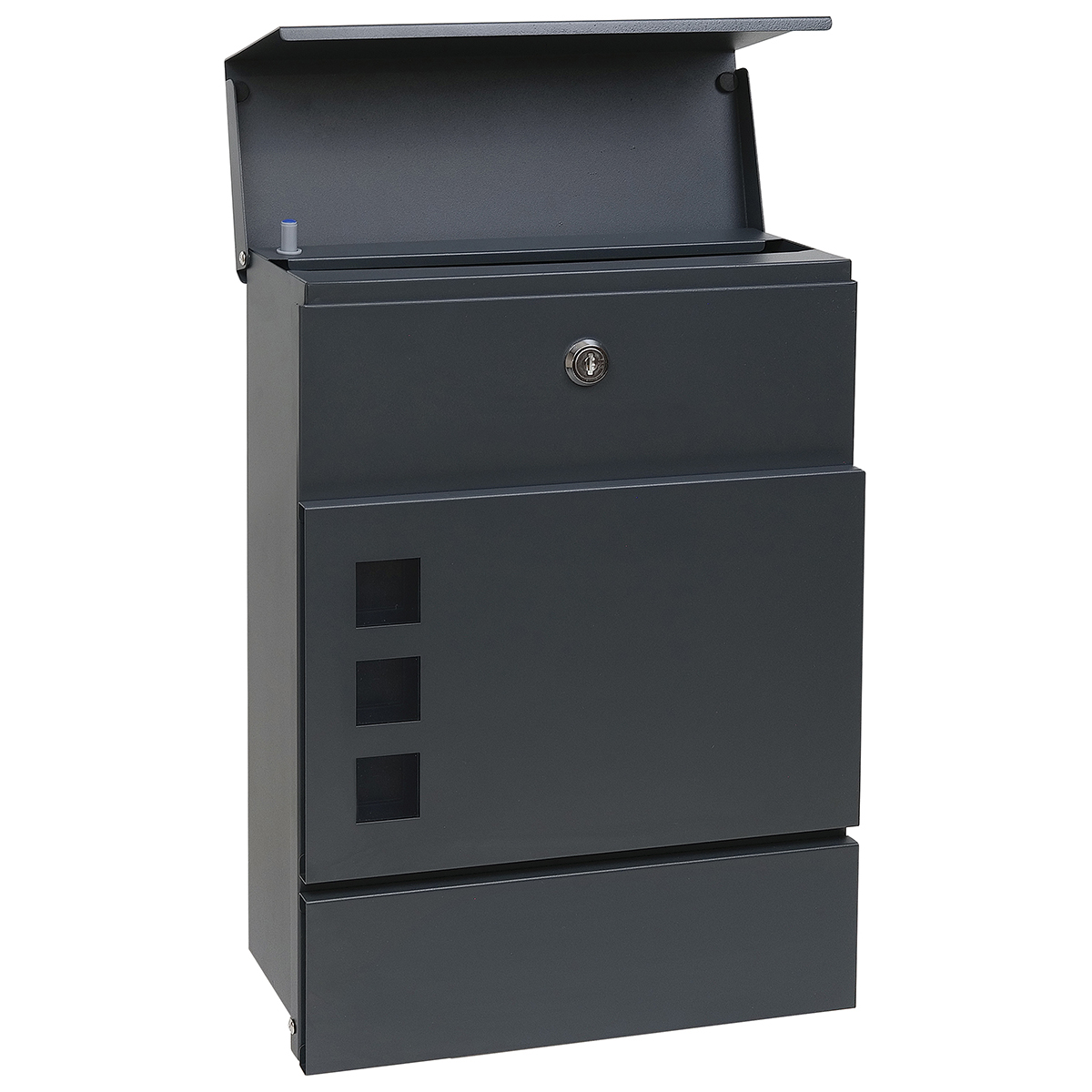 Oceľová domová schránka v modernom dizajne s priehľadnými okienkami vhodná do interiéru i exteriéru Funkcia tichého dovierania striešky pomocou brzdy Šírka:270 mm Výška:370 mm Hĺbka:110 mm Rozmer vhodu: 260x30 mm Materiál: ocel hrúbka 0,9 mm Povrchová úprava: antracit matná (RAL7016) Balenie obsahuje montážny materiál a 2 ks kľúčov na otvorenie zámku Hmotnosť netto: 2,1 kg