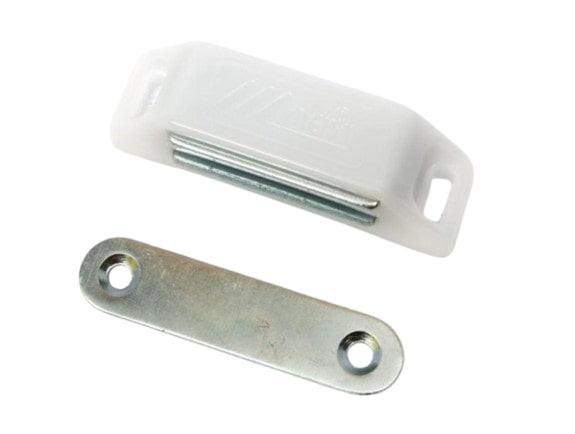 Magnetická sklapka na nábytok. Skladá sa z dvoch častí - magnetickej časti a protiplechu