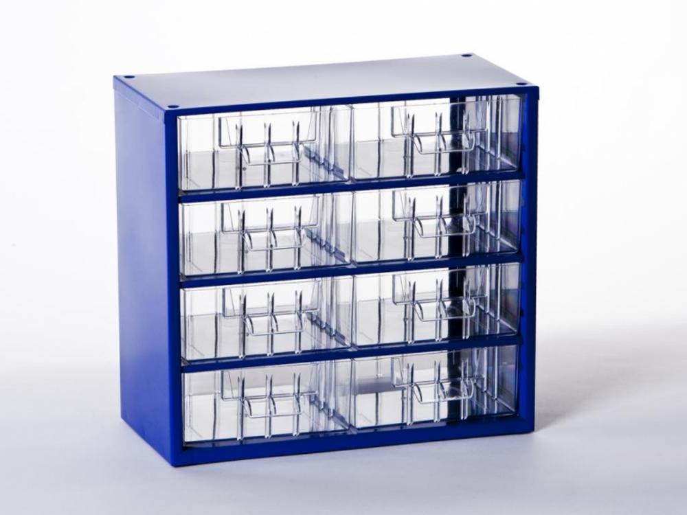 Kvalitné a odolné skrinky Mars, ktoré nesmú chýbať ani vo Vašej dielni, sú vyrobené z oceľového plechu a opatrené odolným práškovým lakom Číre zásuvky a prepážky sú vyrobené z trvanlivého materiálu PS (polystyrol) 8 stredných zásuviek Výška: 282 mm Šírka: 306 mm Hĺbka rámu: 145 mm Hĺbka vrátane presahu zásuviek: 155mm