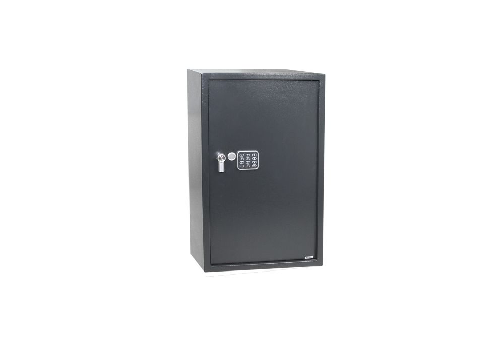 Oceľový trezor s elektronickým zámkom číselnou klávesnicou a páčkou na otvorenie Užívateľský kód môže obsahovať 3-8 číslic, tzn. až 100 000 000 kombinácií kódov Časová blokácia zámku po troch chybných pokusoch Indikácia nízkeho stavu napätia v batérii Do vnútorného priestoru, ktorý je rozčlenený policou sa zmestí cca 10 šanonov Vonkajší rozmer: š-v-h: 450 x 750 x 400 mm Vnútorný rozmer: š-v-h: 446 x 746 x 360 mm Hrúbka materiálu: dvere 2 mm, plášť 4 mm Objem: 119,7l Hmotnosť netto: 33kg Balenie obsahuje: batérie AA 4ks, núdzový kľúč 2ks, polička 1ks, vnútorná plstená výstelka, oceľové hmoždinky a skrutky