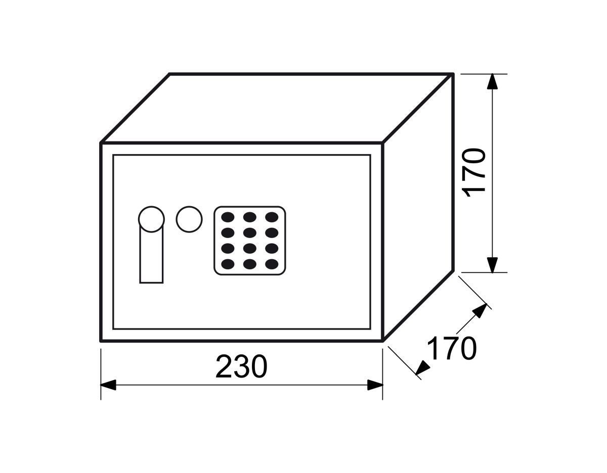 Oceľový sejf s elektronickým zámkom, číselnou klávesnicou a páčkou k otvoreniu 100 000 000 číselných kombinácií. časová blokácia zámku po 3 chybných pokusoch Rozmer vonkajší:š-v-h: 230 x 170 x 170 mm Rozmer vnútorný: š-v-h: 228 x 168 x 120 mm Balenie obsahuje: batérie AA 4ks, 2ks núdzových kľúčov, filc, ocelové hmoždinky, skrutky