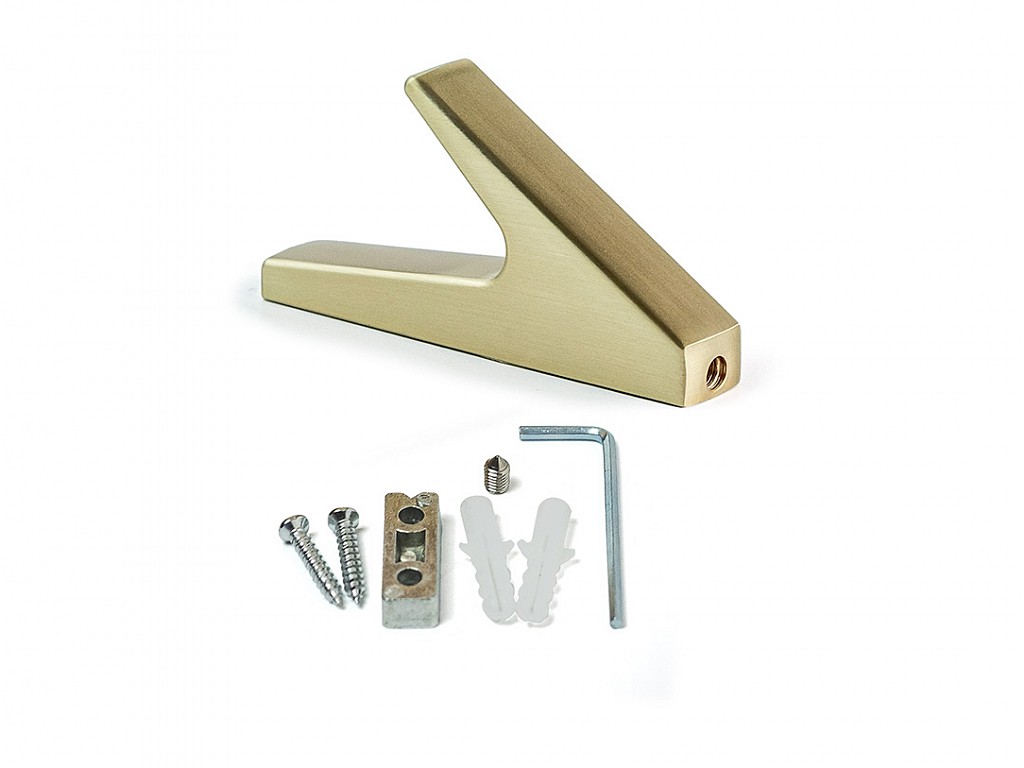 Moderný vešiak Prokop v zlatom matnom prevedení Vešiak má skryté uchytenie Na stenu sa 2 skrutkami prichytí upevňovací kompopnent. Na tento komponent sa nasadí vešiak a pritiahne sa ku komponentu na spodnej strane červíkom a priloženým imbusovým kľúčom sa dotiahne Celková dĺžka: 79 mm