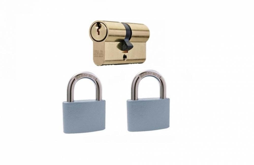 Sada na spoločný uzáver (SU) - jedným kľúčom otvoríte všetky 3 produkty 1x cylindrická vložka FAB 100RSD 2x visiaci zámkok 80RSH, šírka 52cm 5ks kľúčov