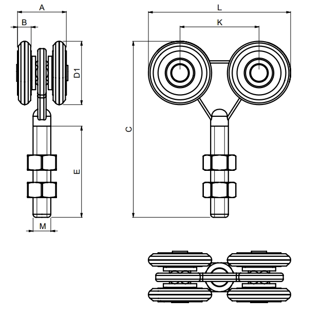 Vozík štvorkolieskový ložiskový pre posuvné brány je určený pre pohyb v profile Strela 42, jeho nosnosť je 280kg Rozmery podľa technického nákresu z obrázka: D1 - 42mm, A - 33mm, B - 9mm, C - 115mm, E - 60mm, K - 52mm, L - 94mm, M - M12