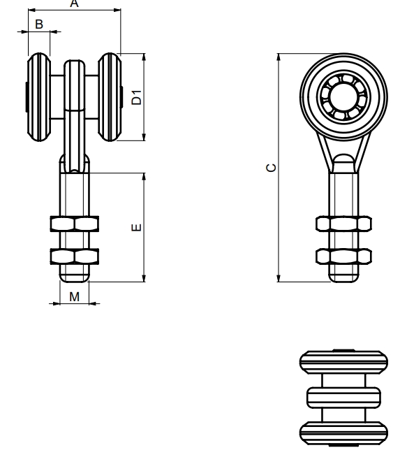 Vozík dvojkolieskový guličkový pre posuvné dvere, brány a svetlolamy je určený pre pohyb v profile Strela 33, jeho nosnosť je 45kg Rozmery podľa technického nákresu z obrázka: D1 - 24mm, A - 25mm, B - 6mm, C - 71mm, E - 36mm, M - M8