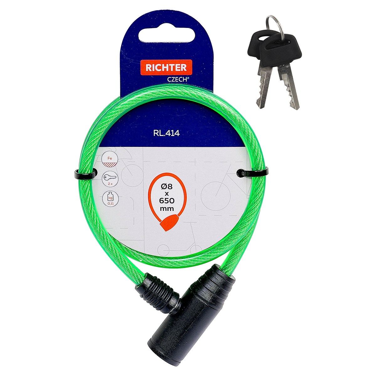 Štandardný lankový zámok na bicykel Vložka zámku so štyrmi odpruženými stavítkami 2 kľúče v balení Dĺžka: 650mm Priemer lanka: 8mm