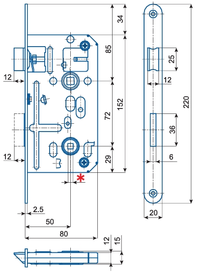 Ako správne vybrať zadlabací zámok? rozteč – vzdialenosť medzi stredom kľučky (osou štvorhranu) a stredom otvoru pre uzamykací mechanizmus (napr. pre cylindrickú vložku) backset – vzdialenosť od čela zadlabacieho zámku k ose kľučky hĺbka (šírka) zádlabu výška čela šírka čela typ otvárania dverí – pravé alebo ľavé