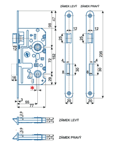Ako správne vybrať zadlabací zámok? rozteč – vzdialenosť medzi stredom kľučky (osou štvorhranu) a stredom otvoru pre uzamykací mechanizmus (napr. pre cylindrickú vložku) backset – vzdialenosť od čela zadlabacieho zámku k ose kľučky hĺbka (šírka) zádlabu výška čela šírka čela typ otvárania dverí – pravé alebo ľavé