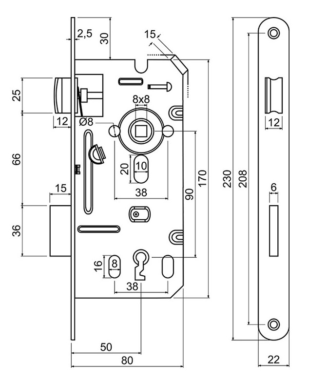 Zadlabací zámok pre obyčajný kľúč Pravoľavá strelka Jednozápadková závora V balení sa nachádzajú 2 kľúče a vruty Povrchová úprava - čierna