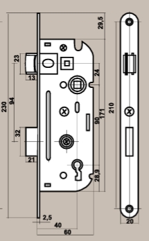 Ako správne vybrať zadlabací zámok? rozteč – vzdialenosť medzi stredom kľučky (osou štvorhranu) a stredom otvoru pre uzamykací mechanizmus (napr. pre cylindrickú vložku) backset – vzdialenosť od čela zadlabacieho zámku k ose kľučky hĺbka (šírka) zádlabu výška čela šírka čela typ otvárania dverí – pravé alebo ľavé
