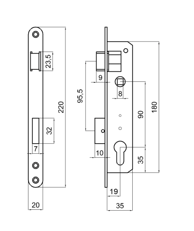 Vložkový úzky zámok s roztečou 90mm, a šírkou zámku 35mm, čím je vhodný pre úzke bránky