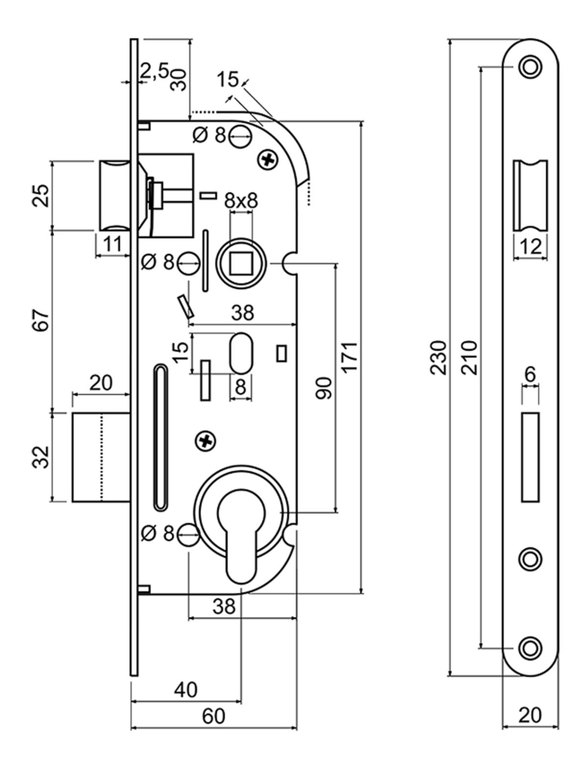 Zadlabací zámok pre cylindrickú vložku Pravoľavá strelka Dvojzápadková závora V balení sa nachádzajú vruty (2ks) a istiaci šrób (1ks)