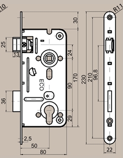 Ako správne vybrať zadlabací zámok? rozteč – vzdialenosť medzi stredom kľučky (osou štvorhranu) a stredom otvoru pre uzamykací mechanizmus (napr. pre cylindrickú vložku) backset – vzdialenosť od čela zadlabacieho zámku k ose kľučky hĺbka (šírka) zádlabu výška čela šírka čela typ otvárania dverí – pravé alebo ľavé