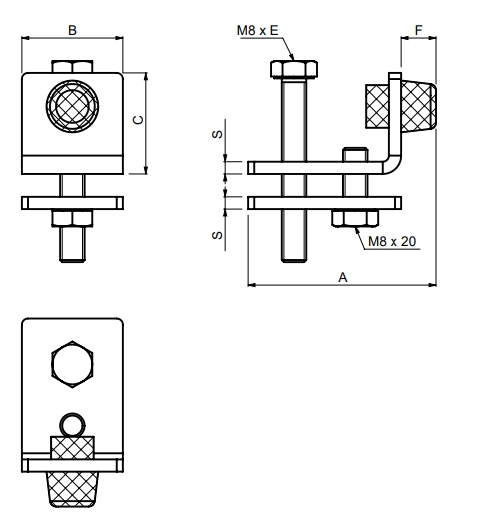 Vnútorný doraz je určený do profilu Strela 33 Zamedzuje vybehnutu vozíkov z profilu pri pohybe Rozmery podľa technického nákresu z obrázka: A - 61mm, B - 22mm, C - 22mm, E - 35mm, F - 11mm, S - 3mm