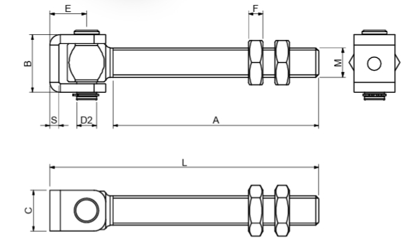Záves nastaviteľný so závitovou tyčou pre drevené a kovové stĺpy Rozmery podľa technického nákresu z obrázka: M - M20, A - 145mm, L - 188mm, B - 39mm, C - 28mm, D2 - 14mm, E - 25mm, F - 10mm, S - 6mm