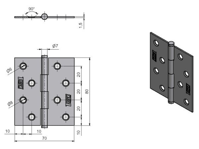 Kĺbový záves zinkový Záves je určený pre pohyblivé spojenie dvoch dielov Kĺbový záves má jednoduchú montáž pomocou priskrutkovania (skrutky nie sú súčasťou balenia) Rozmer roztvoreného závesu: 80x70mm