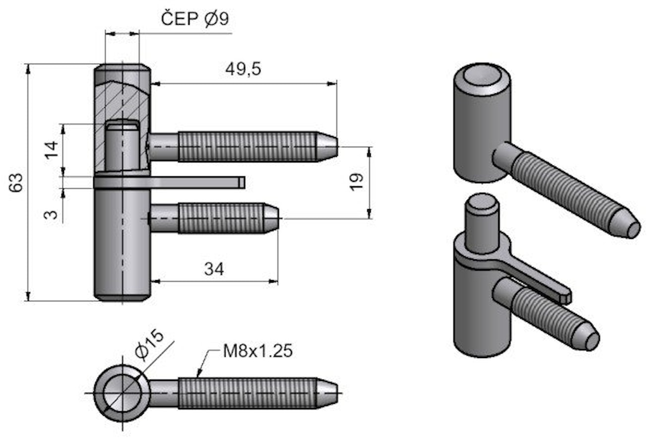 Záves dverový s klinom 60mm M8 žZn