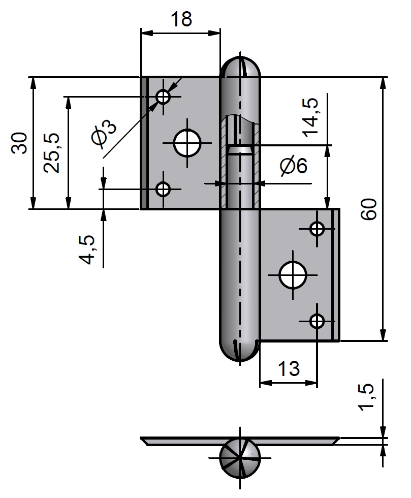 Kompletný okenný záves s dĺžkou 60mm pre pravé okno (rám) Slúži na otočné spojenie okenného krídla s rámom Bez povrchovej úpravy Nosnosť 1ks: 8kg