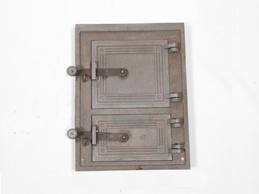 Dvierka liatinové prikladacie, sporákové, veľké - komplet Rozmer: 195 x 170mm /Uvedený rozmer je vnútorný rozmer stavebného otvoru kachlí, do ktorého sa dvierka montujú/ Celkový rozmer: 390 x 290mm Materiál: liatina