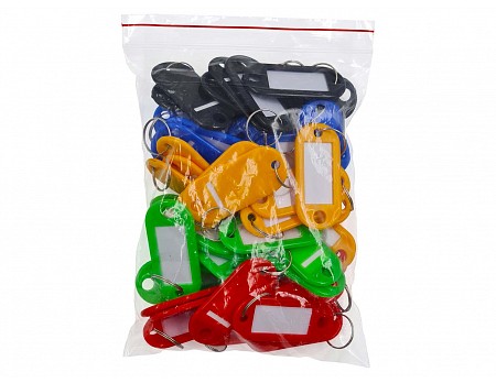 Farebné plastové visačky na kľúče, s papierikom na označenie. Predáva sa v ucelenom balení 50 kusov