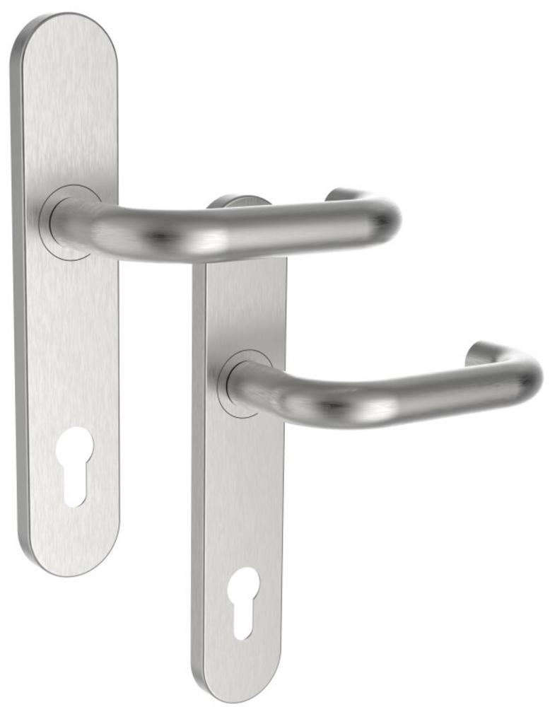 Nerezové kovanie na vložku v prevedení kľučka-kľučka Rozteč: 72 mm Vhodné na dvere s vyššou frekvenciou priechodov, napríklad do skladov, výrobných hál a administratívnych priestorov Možné použiť aj v exteriéri - odolnosť voči vonkajším vplyvom Kovanie je skúšané na 200 000 cyklov Ocelové telo výstuhy, zosilnená konštrukcia a pevné spojenie kľučky so štítom, zaisťujú vysokú životnosť a odolnosť Povrchová úprava: matná nerez Vhodné pre hrúbku dverí 38-52mm Kovanie obsahuje vratnú pružinu