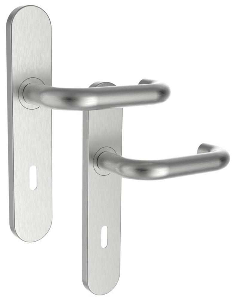 Nerezové kovanie na kľúč v prevedení kľučka-kľučka Rozteč: 90 mm Vhodné na dvere s vyššou frekvenciou priechodov, napríklad do skladov, výrobných hál a administratívnych priestorov Možné použiť aj v exteriéri - odolnosť voči vonkajším vplyvom Kovanie je skúšané na 200 000 cyklov Ocelové telo výstuhy, zosilnená konštrukcia a pevné spojenie kľučky so štítom, zaisťujú vysokú životnosť a odolnosť Povrchová úprava: matná nerez Vhodné pre hrúbku dverí 38-52mm Kovanie obsahuje vratnú pružinu