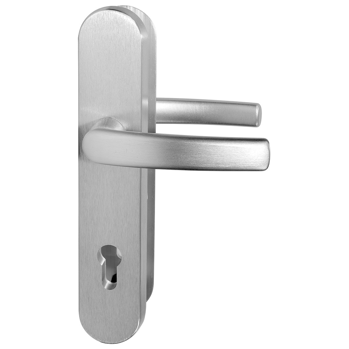 Bezpečnostné kovanie v prevedení kľučka - kľučka, bez prekrytia (PZ), rozteč 90mm Povrchová úprava strieborný elox (F1) Trieda bezpečnosti 2 Použite s cylindrickou vložkou v triede bezpečnosti minimálne 2 Vhodné pre hrúbku dverí: 40-55mm (pre hrubšie dvere je nutné doobjednať predlžovaciu sadu)