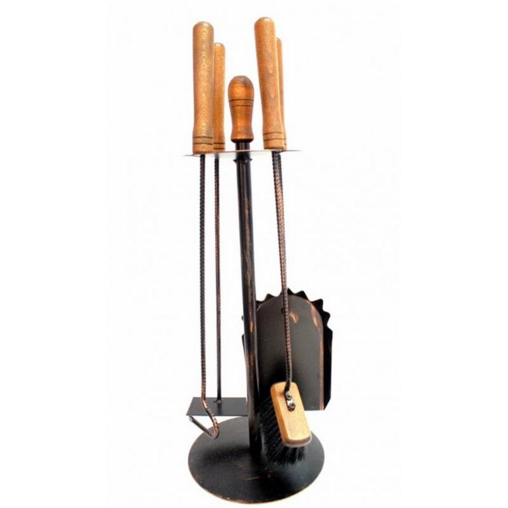 Kvalitné krbové náradie s drevenými prvkami Sada obsahuje: metličku, kutáč, vyhrabávač a lopatku Výška stojanu: 46cm Celková výška s náradím: 62cm Farba: čierny antik