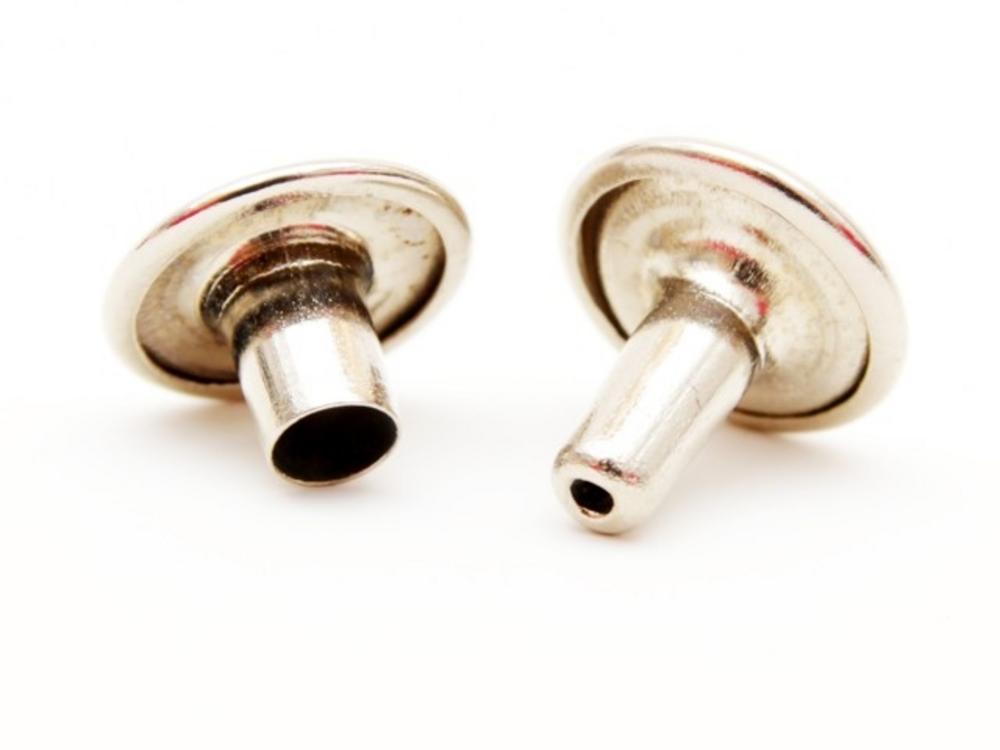 Nit dutý sa skladá z dvoch častí, používa pri výrobe opaskov, kabeliek, peňaženiek obuvy, všade kde potrebujete pevný spoj, použitie ako ozdoba i pri ľudovej tvorbe Aplikujeme lisom, lisovacími kliešťami, alebo kladivom Rozmery AxBxCxDxE: 3x8x7,5x9,5x5,2mm Balenie: 100ks