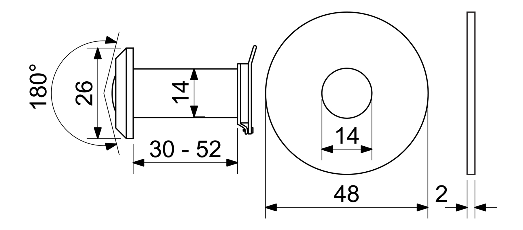 Dverné kukátko s pozorovacím uhlom 180°, vhodné pre dvere hrubé 30-52mm Vrátane dvoch podložiek Priemer otvoru: 14mm Farebné prevedenie: lesklý chróm Zorný uhol: 180°
