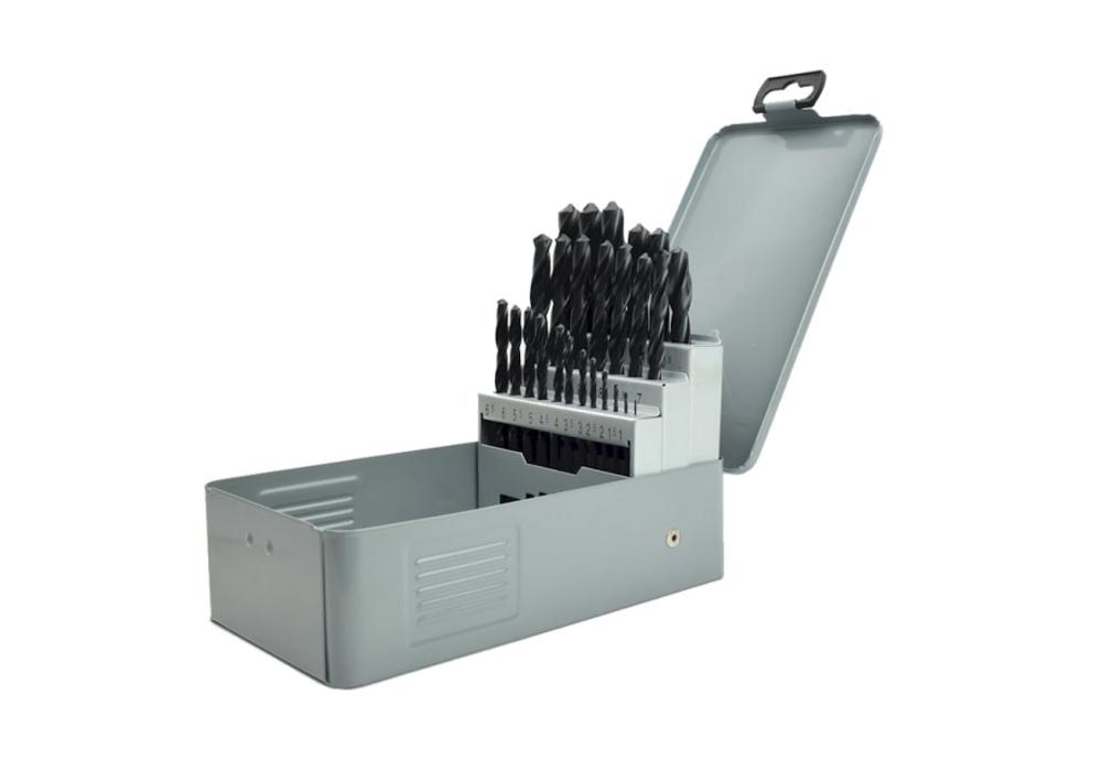 25-dielna sada HSS vrtákov na kov s priemermi 1,0 - 13,0 mm (po 0,5mm) v kovovej kazete Vrtáky sú určené na vŕtanie nelegovanej ocele, neželezných kovov a plastov Materiál: HSS oceľ