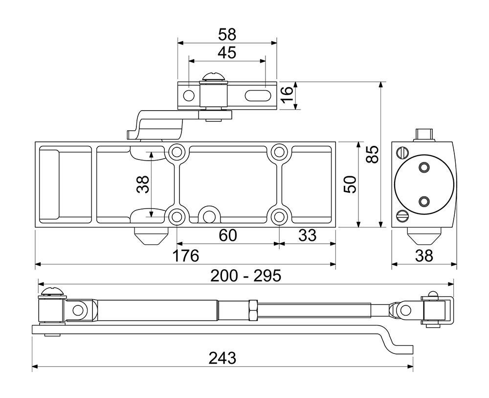 Vhodný pre požiarne dvere podľa EN 1634 so zatváracou silou 3 Nastaviteľná rýchlosť zatvárania a doťahu Hmotnosť dverí: 65kg Šírka dverí: 95cm Uhol otvárania dverí max. 180° Montáž na dvere alebo na zárubňu Balenie vrátane štandardného ramienka a montážneho materiálu