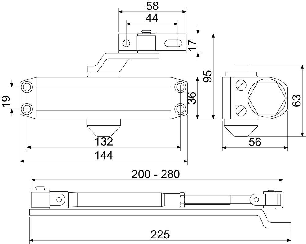 Dverný zatvárač pre interiérové dvere Zatváracia sila 2 podľa EN 1154 Nastaviteľná rýchlo zatvárania a dovretia Uhol otvorenia dverí: max 160° Váha dverí: do 45kg Šírka dverí: do 85cm Montáž na dvere alebo zárubňu Balenie obsahuje ramienko a montážny materiál