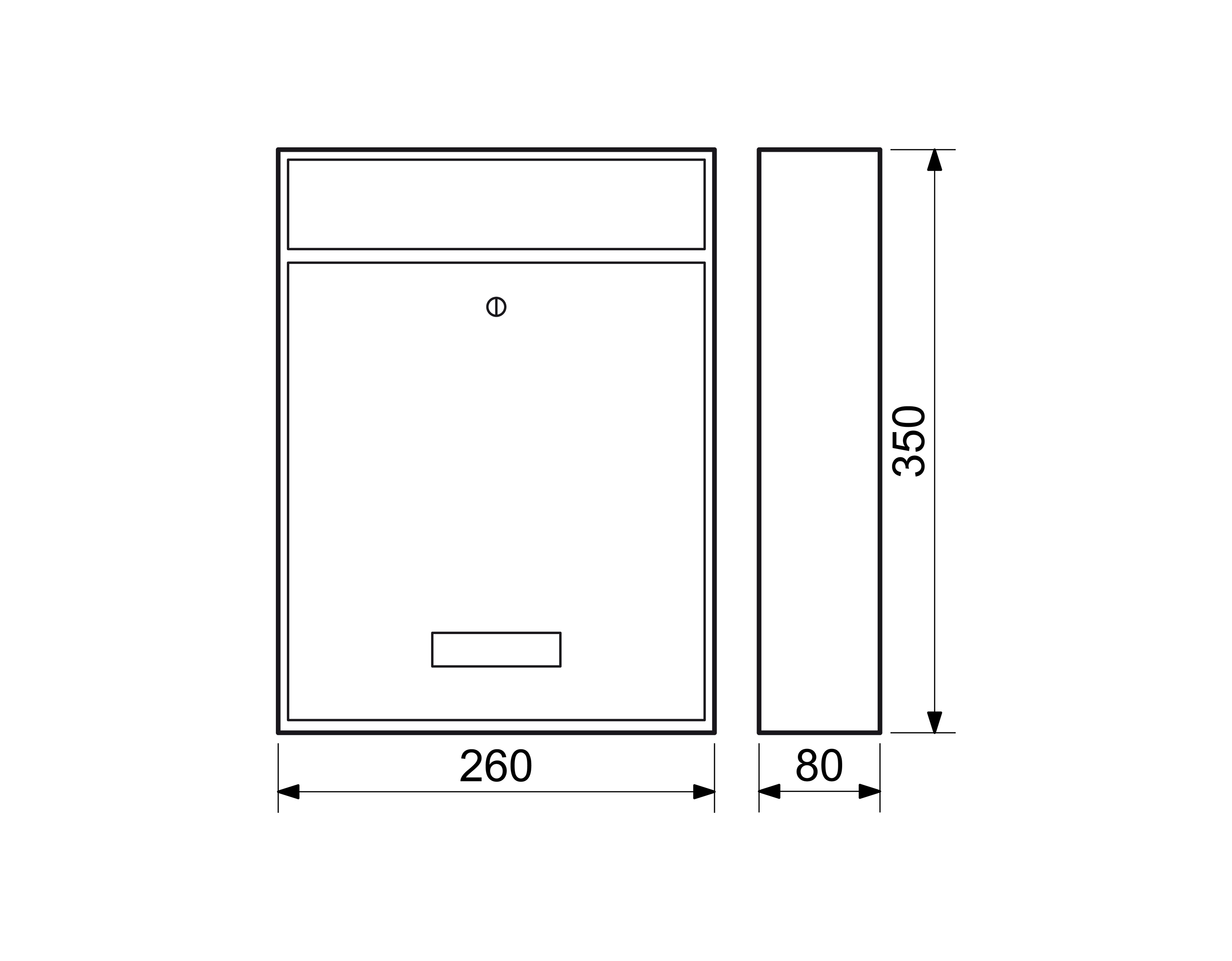 Jednoduchá, poštová schránka vhodná aj pre použitie do zostáv Rozmer: š-v-h: 260 x 350 x 80 mm Rozmer vhodu: š-v: 220 x 30 mm Hrúbka materiálu: 0,6 mm Balenie vrátane montážneho materiálu a 2 ks kľúčov