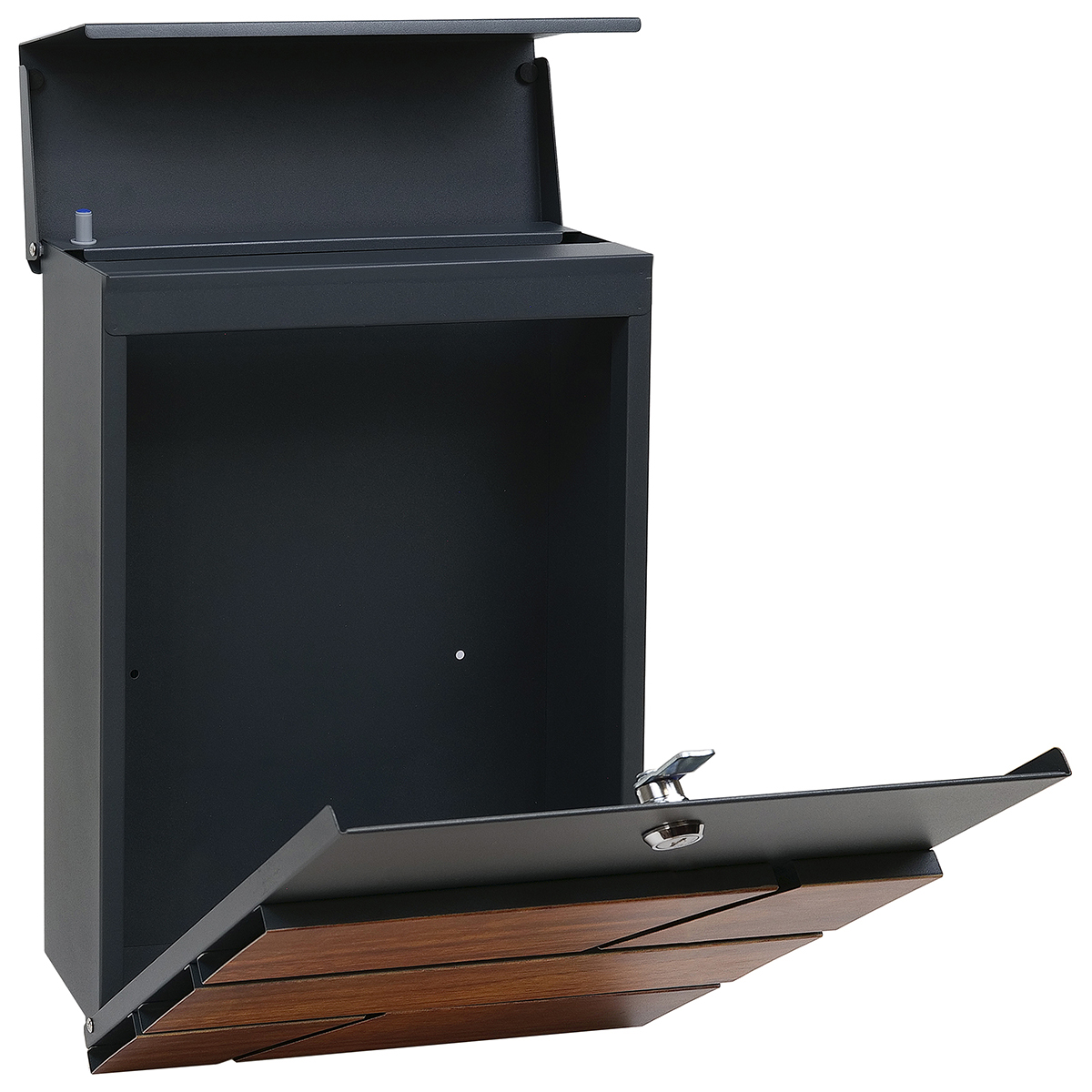 Oceľová domová schránka v modernom dizajne vhodná do interiéru i exteriéru Funkcia tichého dovierania striešky pomocou brzdy Šírka:270 mm Výška:370 mm Hĺbka:110 mm Rozmer vhodu: 260x30 mm Materiál: ocel hrúbka 0,9 mm Povrchová úprava: antracit matná (RAL7016)/Imitácia dreva potlač -WO Balenie obsahuje montážny materiál a 2 ks kľúčov na otvorenie zámku Hmotnosť netto: 2,1 kg