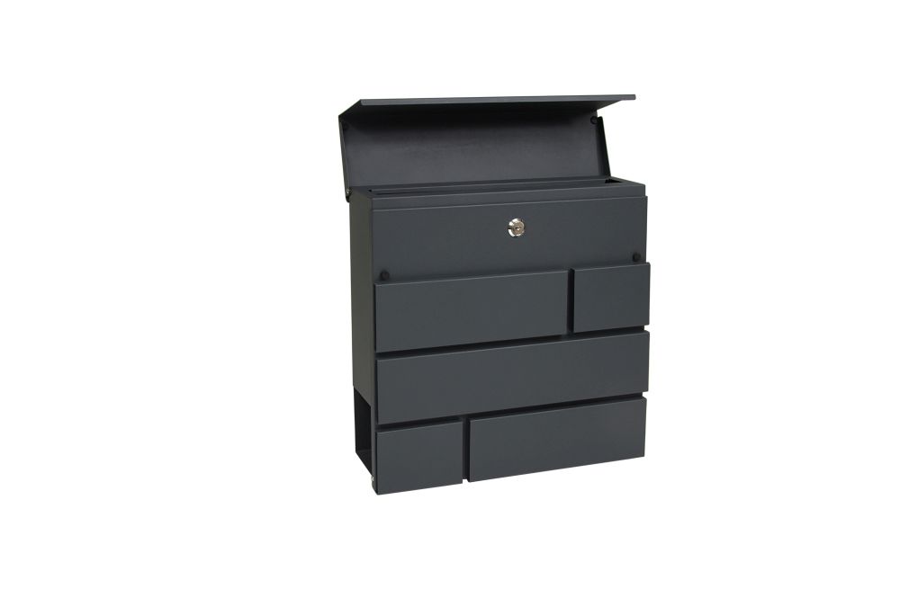 Dizajnová poštová schránka s tubusom na letáky vhodná do interiéru i exteriréu Šírka: 370mm Výška: 370 mm Hĺbka: 105 mm Rozmer vhodu: 337x35mm Materiál: ocel (telo a horný kryt hrúbka 1mm,dvierka hrúbka 0,7mm) Povrchová úprava: antracit matný (RAL7016) Balenie obsahuje montážny materiál a 2 ks kľúčov na otvorenie zámku Hmotnosť netto: 2,9 kg