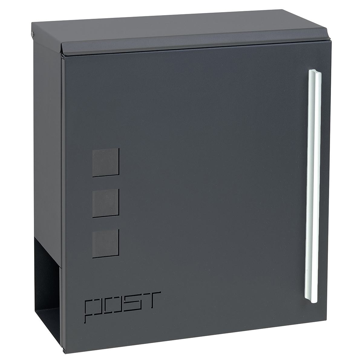 Oceľová poštová schránka s tubusom na letáky so zvýšenou ochranou proti prieniku vody Okienka z číreho plexiskla umožnujú čiastočný priehľad do vnútra Rozmer schránky š/v/h: 310x345x115mm Rozmer vhodu š/v:303x28mm Hrúbka plechu: 0,8mm Balenie obsahuje montážny materiál a 2 ks kľúčov Povrchová úprava: antracit matná AM (RAL7016)
