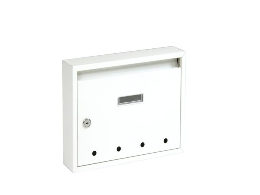 Tradičná poštová schránka s predným vhodom a predným výberom pošty V dvierkach sú vyseknuté štyri drobné kruhové priezory pro kontrolu došlej pošty Vhodná ako pre samostatné použitie, tak aj do zostáv Schránka má rozmery 320x240x60mm, materiál oceľ s práškovou povrchovou úpravou v bielej farbe. Je dodávaná s montážnym materiálom a 2 kľúčmi