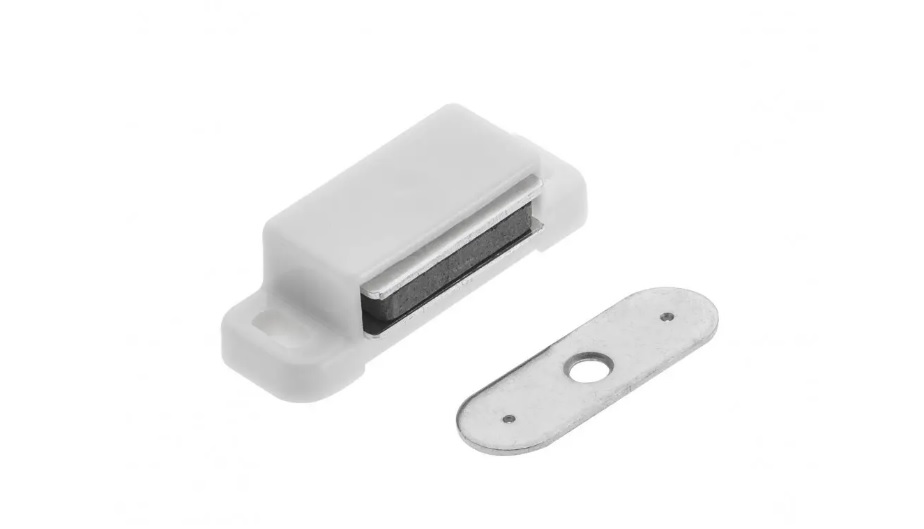 Magnetická sklapka na nábytok. Skladá sa z dvoch častí - magnetická časť a protiplech